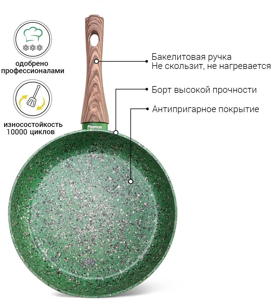 EcoStone покрытие, которое выбирают профессиональные повара, пятна разных цветов отвечают за устойчивость к разным видам воздействий и защищают от разных типов повреждений, тем самым продлевая срок службы изделий. Бакелитовые ручки с soft-touch покрытием «под дерево» удобны в использовании, приятны на ощупь, не скользят, не нагреваются. Глубокая форма позволяет готовить на всю семью, экономя время, силы и электроэнергию. Высокие борта прекрасно подходят не только для жарки, но и для тушения блюд. Уникальный зелёный оттенок, приятный глазу, удовлетворит потребности самых изысканных и современных покупателей. Серия Malachite — это полный набор посуды для приготовления разных видов блюд: сковороды, ковши, сотейники, кастрюли и вок.