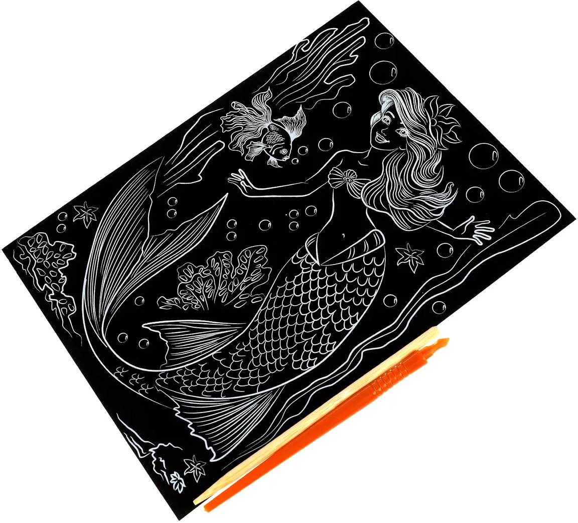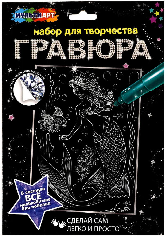Набор для творчества ТМ «Мульти Арт» — отличный подарок для ребёнка, который будет способствовать развитию его творческих способностей. С помощью данного набора юный художник сможет создать эффектную серебристую картину на чёрном фоне. Контур рисунка уже нанесён на основу, остаётся только процарапать изображение специальным штихелем. Готовую поделку можно подарить близким или использовать для украшения интерьера. В составе всё необходимое для поделки. Гравюра с металлическим эффектом (серебристый).