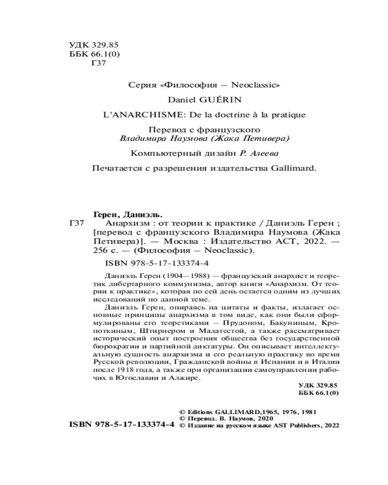 💳 Оплатить за товар можно при получении 🇰🇿 Есть бесплатная доставка по Казахстану от 1 дня 🎁 Копите бонусы с каждой покупки Серия: Философия - Neoclassic Даниэль Герен (1904 —1988) — французский анархист и теоретик либертарного коммунизма, автор книги «Анархизм. От теории к практике», которая по сей день остается одним из лучших исследований по данной теме. |