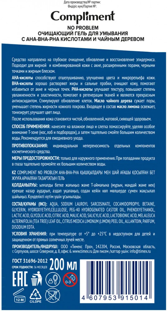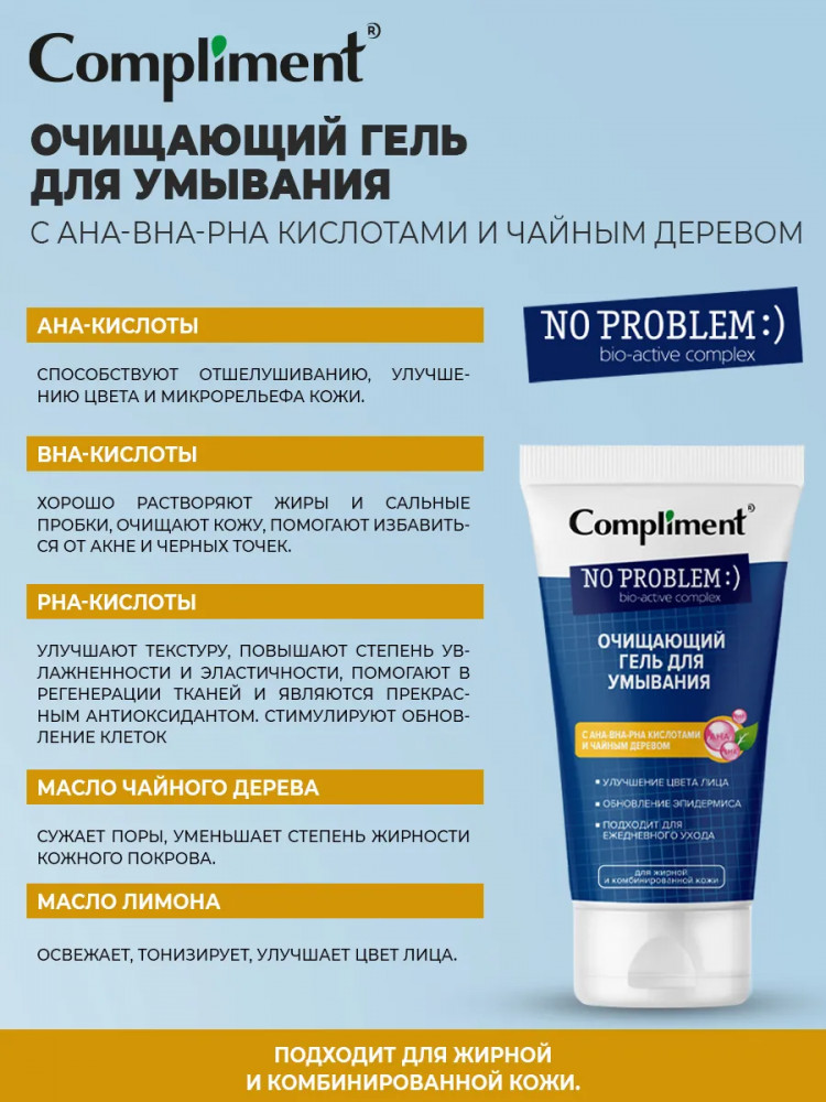 Compliment Гель для умывания очищающий с АНА-ВНА-РНА кислотами и чайным деревом+22 эффективное очищение приятный запах хорошая пенка экономичный расход проблемная кожа