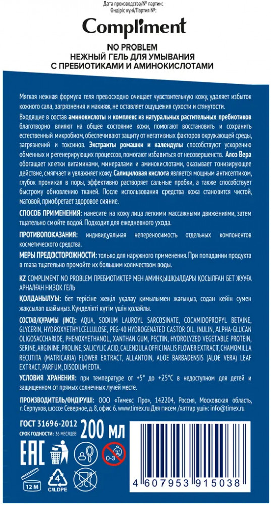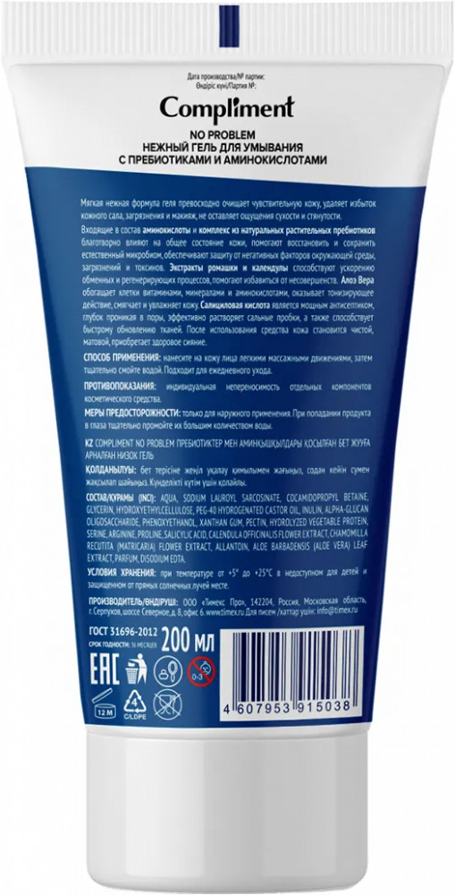 Compliment Гель для умывания с пребиотиками и аминокислотами нежный-20% +53 приятно пахнет мылится хорошо не сушит экономичность не пенится долго смывать