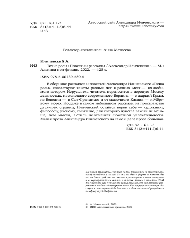 💳 Оплатить за товар можно при получении 🇰🇿 Есть бесплатная доставка по Казахстану 🎁 Копите бонусы с каждой покупки В сборнике рассказов и повестей Александра Иличевского «Точка росы» соседствуют тексты разных лет и разных мест — из любимого автором Иерусалима читатель переносится в нервную Москву девяностых, из холодного современного Берлина — в жаркий Крым, из Венеции — в Сан-Франциско и от сказочного Каспия — к Мёртвому морю. Но даже в самом небольшом рассказе, на пространстве двух-трёх страниц, Иличевский остаётся верен себе — художнику, философу, учёному, писателю, для которого чувства важны не меньше, чем мысли, а стиль не отменяет сюжетной увлекательности. Малая проза Александра Иличевского на самом деле проза большая. |