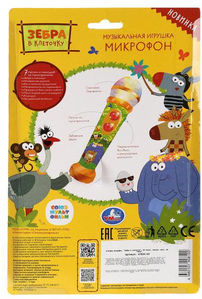 Музыкальный микрофон «Зебра в клеточку» ТМ «УМка» — отличный подарок для маленьких поклонников мультсериала про жизнерадостную зебру и её друзей.