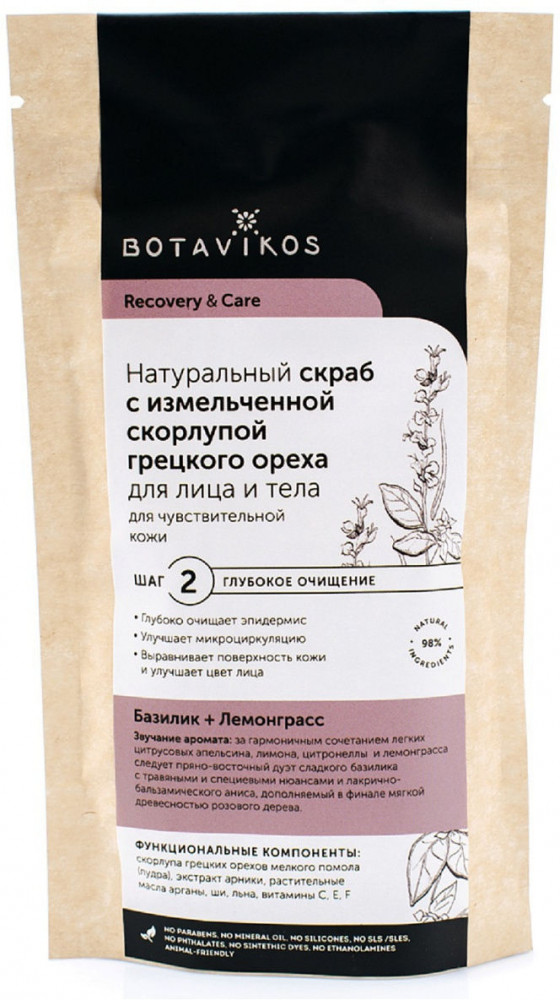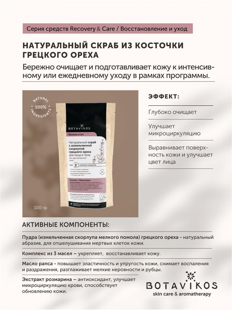 Botavikos Скраб для чувствительной кожиВ данный момент этот товар отсутствует в продаже. Возможно, у нас найдется аналогичный или похожий товар здесь. Серия: Recovery & Care Натуральный скраб с измельченной скорлупой грецкого ореха Recovery & Care является универсальным решением — подходит для лица и тела. Подходит для чувствительной кожи — благодаря измельченной в пудру скорлупе грецких орехов. Деликатное очищение — мягко отшелушивает мертвые клетки кожи, обладает восстанавливающим и укрепляющим действием. |
