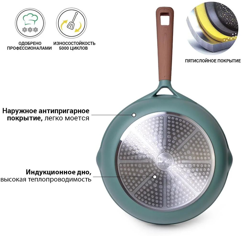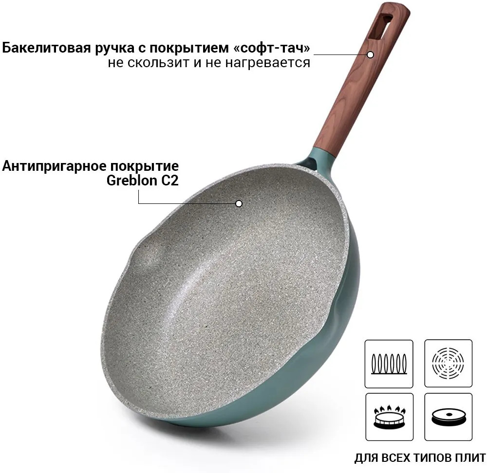 • бакелитовые ручки с soft-touch покрытием «под дерево» удобны в использовании, приятны на ощупь, не скользят, не нагреваются;