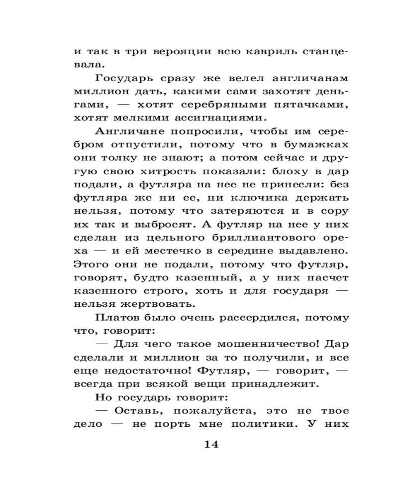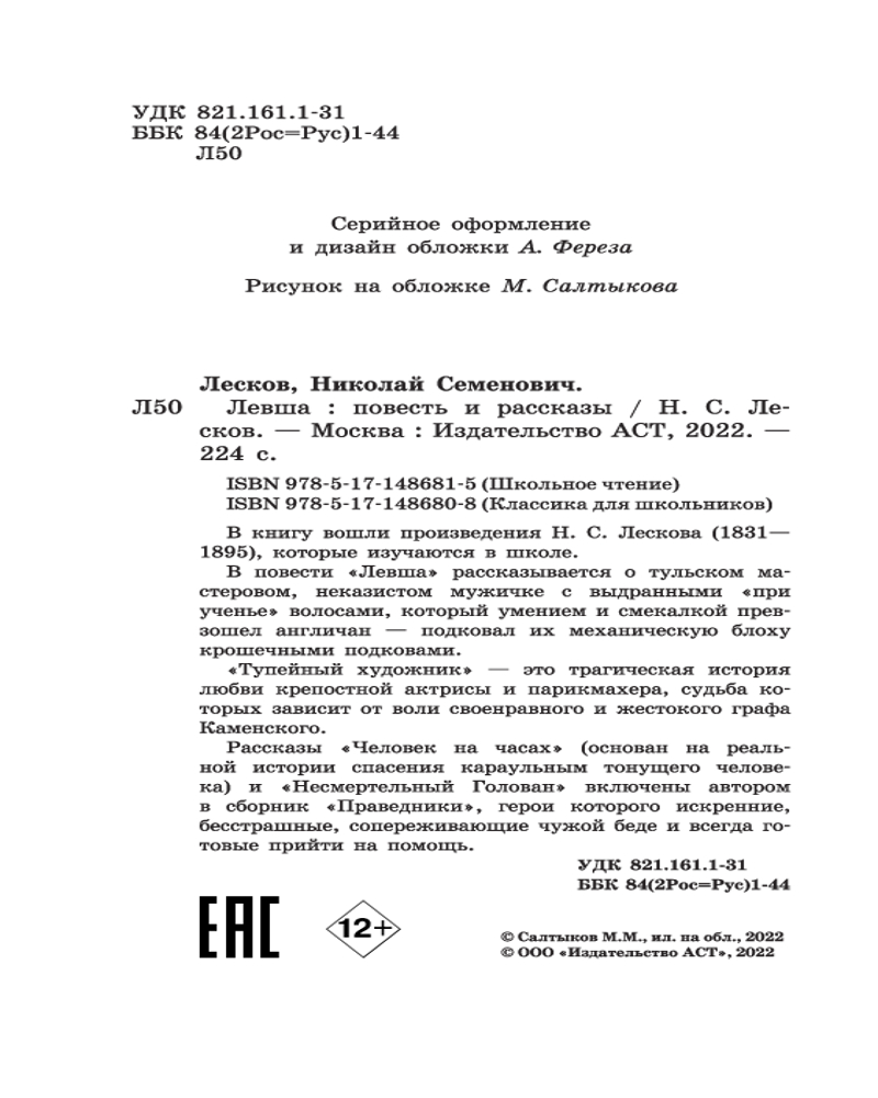 💳 Оплатить за товар можно при получении 🇰🇿 Есть бесплатная доставка по Казахстану от 1 дня 🎁 Копите бонусы с каждой покупки Серия: Школьное чтение В книгу вошли произведения Н. С. Лескова (1831-1895), которые изучаются в школе. В повести «Левша» рассказывается о тульском мастеровом, неказистом мужичке с выдранными «при ученье» волосами, который умением и смекалкой превзошел англичан — подковал их механическую блоху крошечными подковами. «Тупейный художник» — это трагическая история любви крепостной актрисы и парикмахера, судьба которых зависит от воли своенравного и жестокого графа Каменского. Рассказы «Человек на часах» (основан на реальной истории спасения караульным тонущего человека) и «Несмертельный Голован» включены автором в сборник «Праведники», герои которого искренние, бесстрашные, сопереживающие чужой беде и всегда готовые прийти на помощь. |