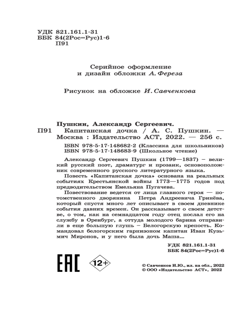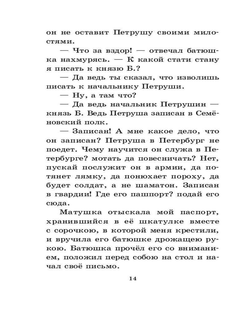 В данный момент этот товар отсутствует в продаже. Возможно, у нас найдется аналогичный или похожий товар здесь. Серия: Классика для школьников Александр Сергеевич Пушкин (1799-1837) — великий русский поэт, драматург и прозаик, основоположник современного русского литературного языка. Повесть «Капитанская дочка» основана на реальных событиях крестьянской войны 1773-1775 годов под предводительством Емельяна Пугачева. Повествование ведется от лица главного героя — потомственного дворянина Петра Андреевича Гринёва, который спустя много лет описывает в своем дневнике события давних времен. Он рассказывает о своем детстве, о том как на семнадцатом году отец послал его на службу в Оренбург, а оттуда молодого барина отправили в еще большую глушь — Белогорскую крепость. Командовал белогорским гарнизоном капитан Иван Кузьмич Миронов, и у него была дочь Маша... |