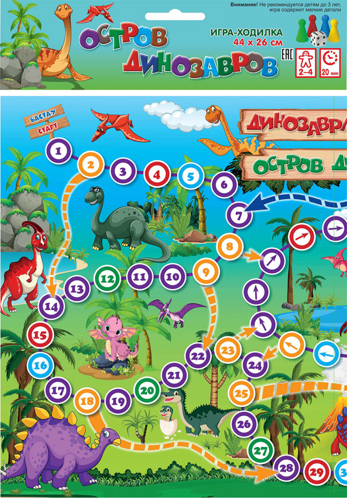 Игра-ходилка «Остров динозавров» развивает умение ориентироваться на плоскости и внимание, подарит массу положительных эмоций для любой компании. Удобный формат игры позволяет взять её в дорогу. |