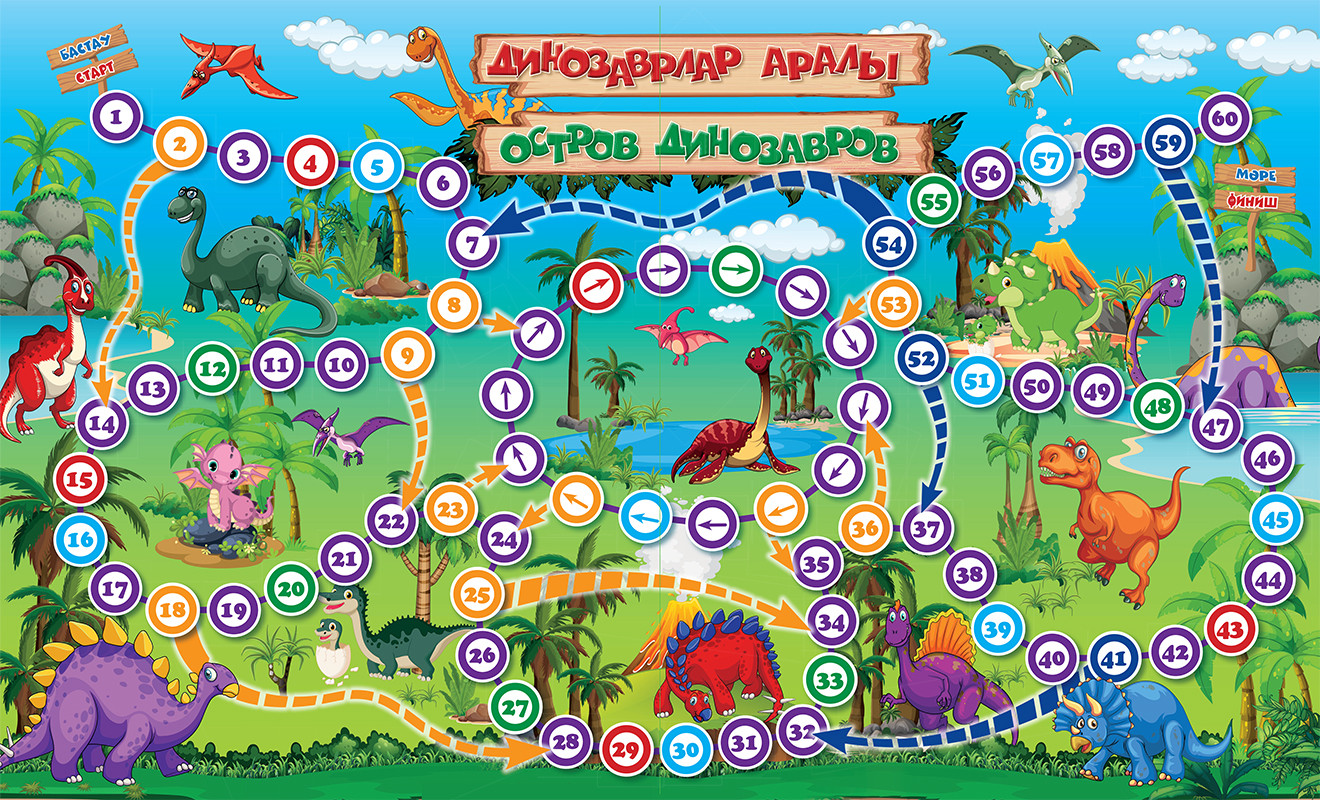 «Динозаврлар аралы» жүрісті үстел ойыны балалардың кеңістікте бағдар жасауын,есте сақтауын дамытады және кез-келген топқа жағымды көңіл-күй сыйлайды. Оның көлемі жолға алып шығуға ыңғайлы етіп жасалған.