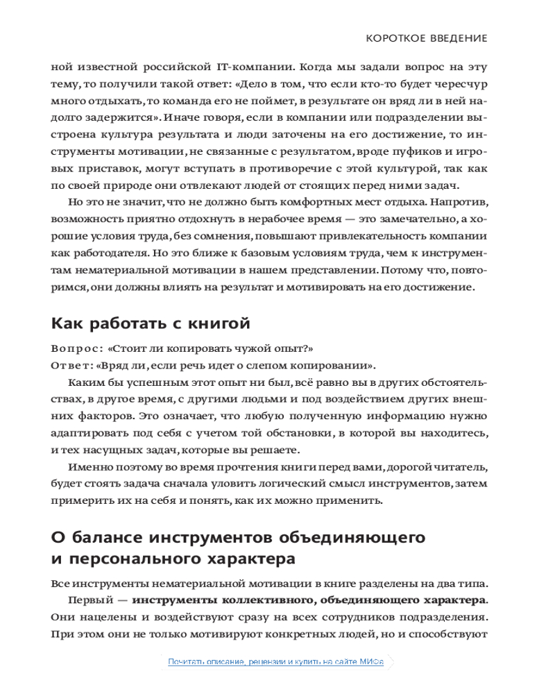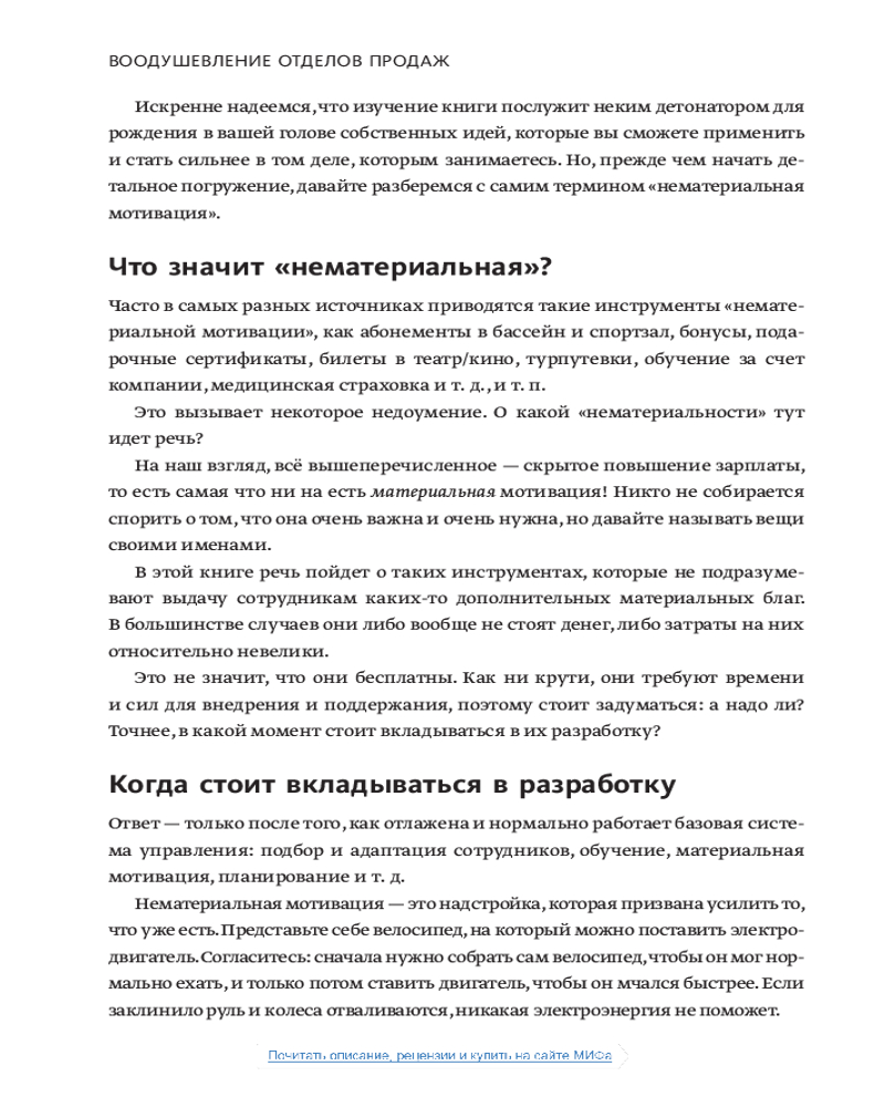 «Нематериальная мотивация — это надстройка, которая призвана усилить то, что уже есть. Представьте себе велосипед, на который можно поставить электродвигатель. Согласитесь: сначала нужно собрать сам велосипед,чтобы он мог нормально ехать, и только потом ставить двигатель, чтобы он мчался быстрее. Если заклинило руль и колеса отваливаются, никакая электроэнергия не поможет.».