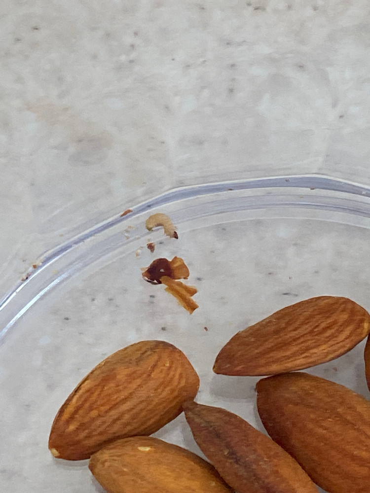 В коробке с миндалем дохлая пищевая моль в количестве 5 штук. Некоторые орешки пришлось выбросить, т.к. были повреждены и покрыты экскрементами насекомых. Много раз брала этот товар, но в этот раз решила, что больше не стоит.
