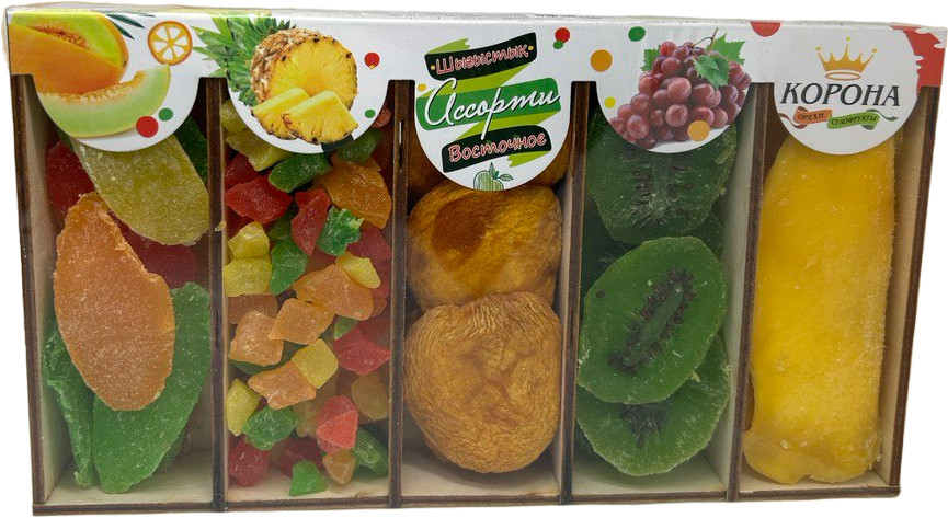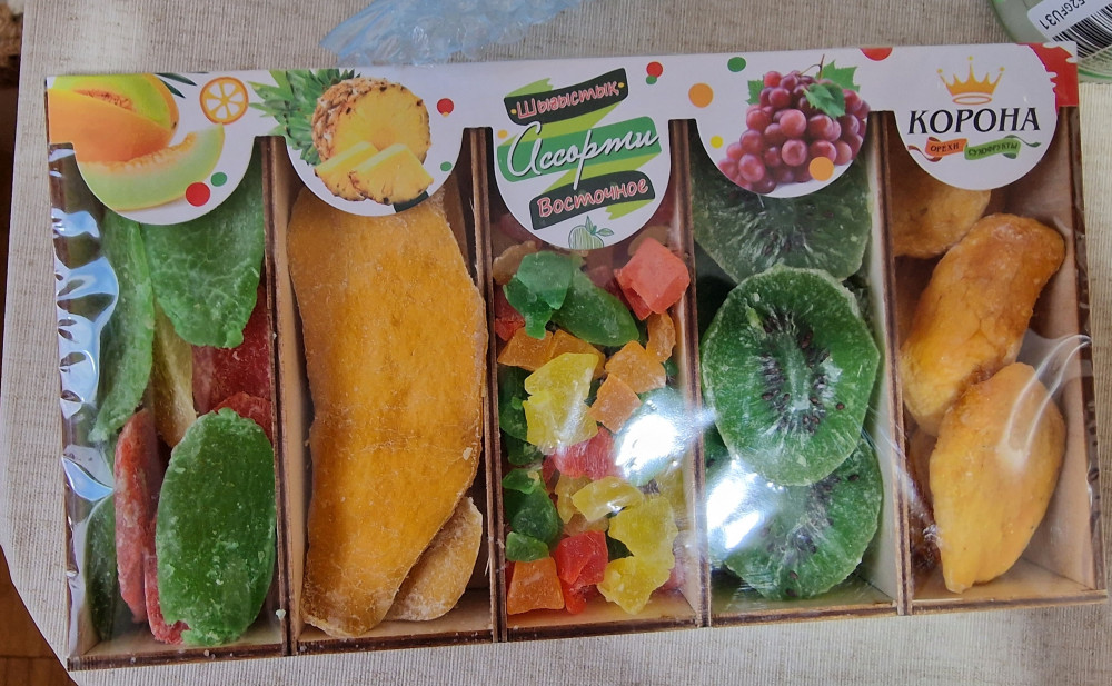 Набор выглядит очень презентабельно. В качестве подарка просто отличная альтернатива шоколадным конфетам. Коробочка деревянная, все целое, самих сухофруктов внутри немного. О вкусе и свежести ничего не могу написать, заказывала на подарок.