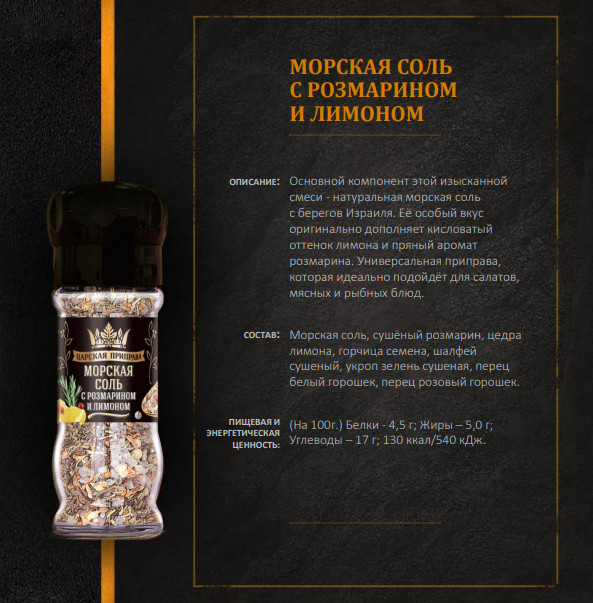 Царская приправа Морская соль с розмарином и лимономВ данный момент этот товар отсутствует в продаже. Возможно, у нас найдется аналогичный или похожий товар здесь. Основной компонент этой изысканной смеси — натуральная морская соль с берегов Израиля. Её особый вкус оригинально дополняет кисловатый оттенок лимона и пряный аромат розмарина. Универсальная приправа, которая идеально подойдёт для салатов, мясных и рыбных блюд. |
