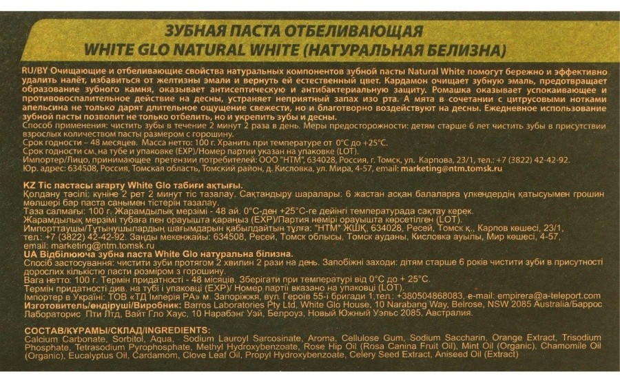 White Glo Зубная паста отбеливающая «Природная белизна»В данный момент этот товар отсутствует в продаже. Возможно, у нас найдется аналогичный или похожий товар здесь. Натуральные компоненты позволяют бережно и эффективно удалить налёт, избавиться от желтизны эмали и вернуть ей естественный цвет.Кардамон очищает эмаль и предотвращает образование зубного камня, оказывает антисептическую и антибактериальную защиту. Мята в сочетании с апельсином и эвкалиптом не только дарят длительное ощущение свежести, но и так же благотворно воздействуют на дёсны. Масло семян шиповника повышает защитные свойства слизистой оболочки полости рта. |