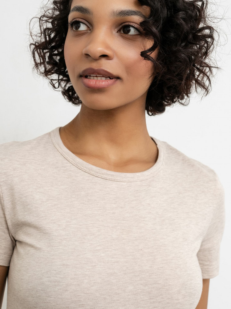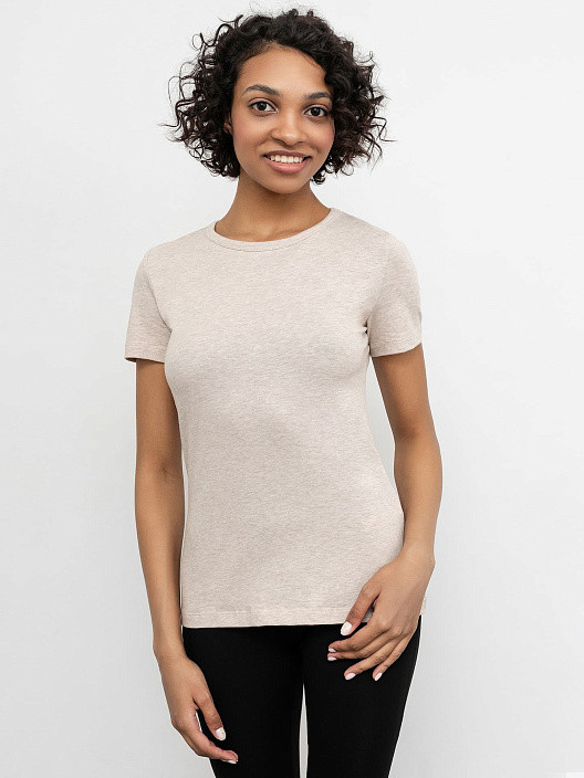 Цвет не такой нежно-розовый, как на фото, скорее бежевый. В целом хорошая футболка на лето, не слишком плотная, но и не тоненькая ткань.