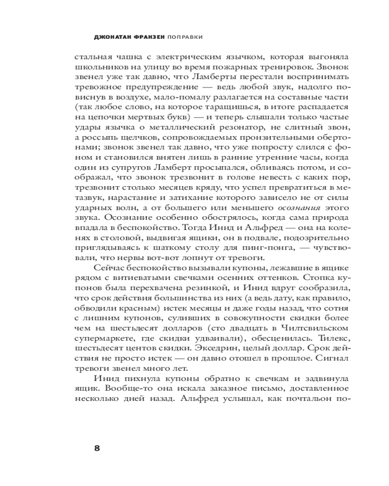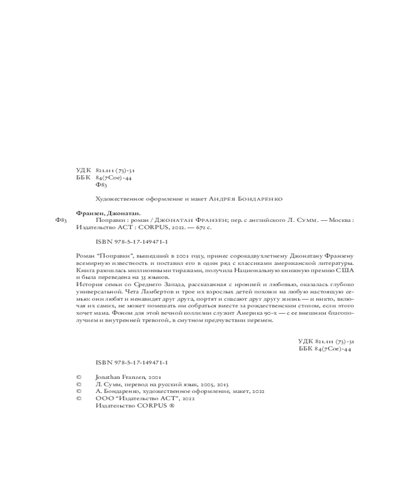 💳 Оплатить за товар можно при получении 🇰🇿 Есть бесплатная доставка по Казахстану от 1 дня 🎁 Копите бонусы с каждой покупки Серия: Весь Джонатан Франзен Действие романа разворачивается вокруг семьи Ламбертов, их жизни и взаимоотношений. Отец-тиран, страдающий деменцией, фрустрированная жена, обделенные любовью повзрослевшие дети — все они, по сути, очень одинокие люди. Джонатан Франзен с большим вниманием раскрывает психологию всех членов семьи, показывает, как люди могут день за днем невольно делать друг друга несчастными. Но также он рассказывает историю восстановления, открывая героям пути примирения и совместного будущего. Название романа «Поправки» Джонатана Франзена в буквальном смысле отсылает к спаду экономического бума конца девяностых годов, который был ранее вызван развитием технологий. Но самые важные «поправки» в романе — это внезапные удары судьбы, которые открывают героям глаза на жизнь, заставляя их выйти из состояния самообмана и отрицания. |