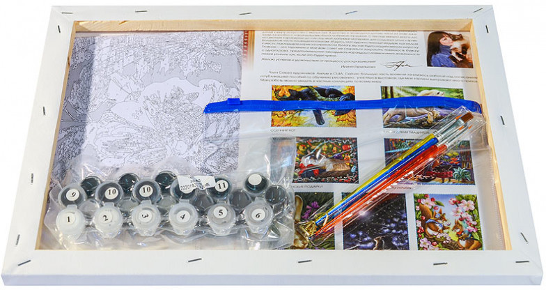 Наборы для раскрашивания комплектуются акриловыми красками, которые не содержат растворителей, вредных компонентов и абсолютно безвредны. До момента высыхания краски смываются водой. Акриловые краски после высыхания образуют эластичную несмываемую пленку, практически не выгорают на солнечном свете и становятся устойчивыми к механическим воздействиям. В наших наборах для рисования краски наносятся без смешивания цветов. Акриловые краски, расфасованы в маленькие баночки, на крышках которых приклеен номер краски.