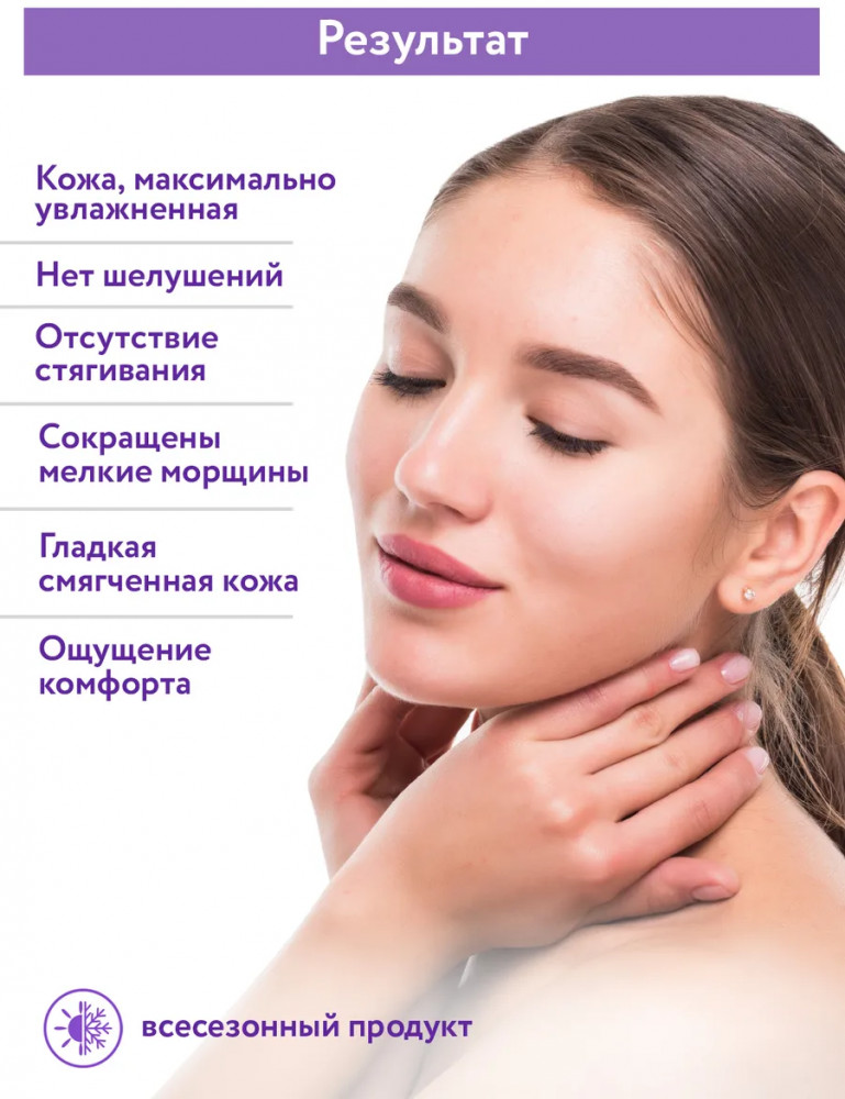 Быстро и полностью впитывается, не оставляет жирного блеска и ощущения пленки. Кожа после него напитана, нежная, бархатистая. Избавляет от сухости. Большой объем.