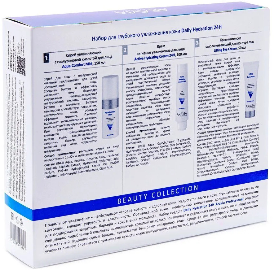 Aravia Набор для глубокого увлажнения кожи лица «Daily Hydration 24H»В данный момент этот товар отсутствует в продаже. Возможно, у нас найдется аналогичный или похожий товар здесь. Ежедневный уход для обезвоженной и склонной к сухости кожи. Средства интенсивно увлажняют, помогая поддерживать защитный барьер и молодость кожи. Формулы средств обогащены ингредиентами, подобранными специально для кожи, склонной к сухости: гиалуроновой кислотой, глицерином, растительными маслами и мочевиной. Активные компоненты притягивают и удерживают влагу в коже, восстанавливая её гидролипидный баланс. Регулярное использование средств избавит от шелушений, чувства стянутости и раздражения, а также повысит эластичность кожи. |