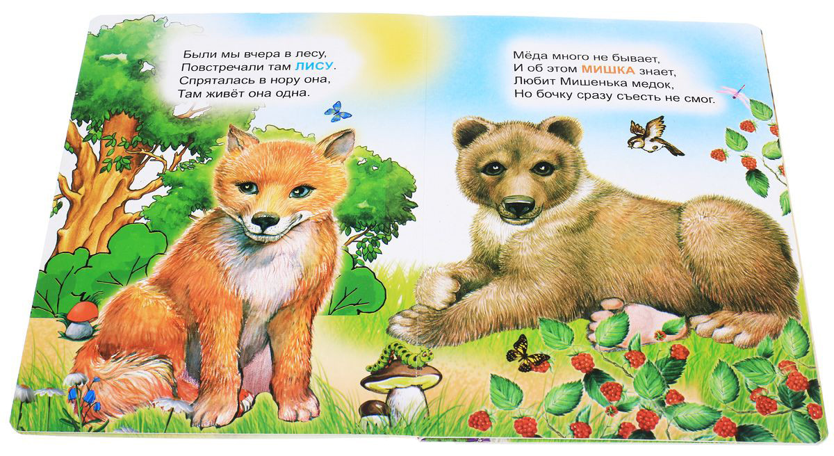 Стишки хорошие, но, на мой взгляд, не хватает в каждом рисунке изображения домика животного, о которых говорится в стихах. Придется объяснять малышу что такое дупло и как выглядит нора в овраге.