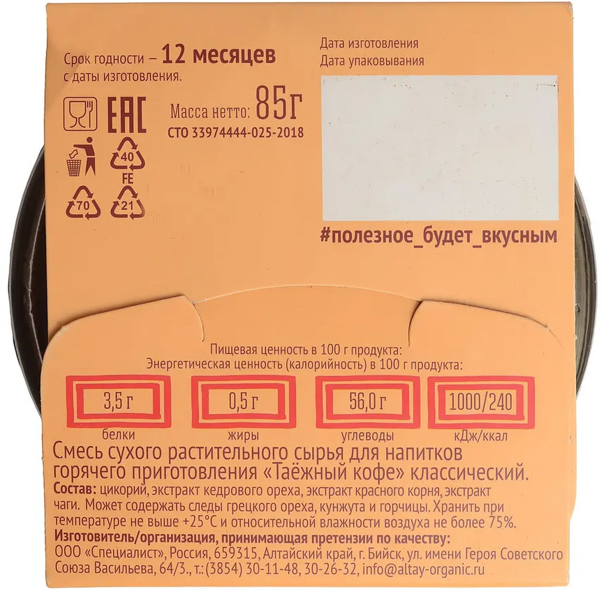 Таежный напиток без кофеина с привкусом кедра. Очень хороший напиток для вегов.Благодарю продавца за такие прекрасные продукты.Благодарю Флипп за разноообразный ассортимент товаров.
