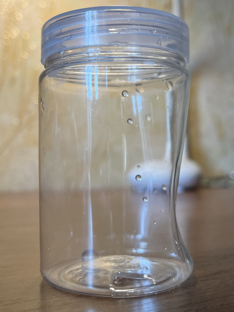 Пришла с вмятиной. Если кто-то ищет емкость для жидкости, то данная баночка не подойдет, слегка протекает. В целом, не критично.
