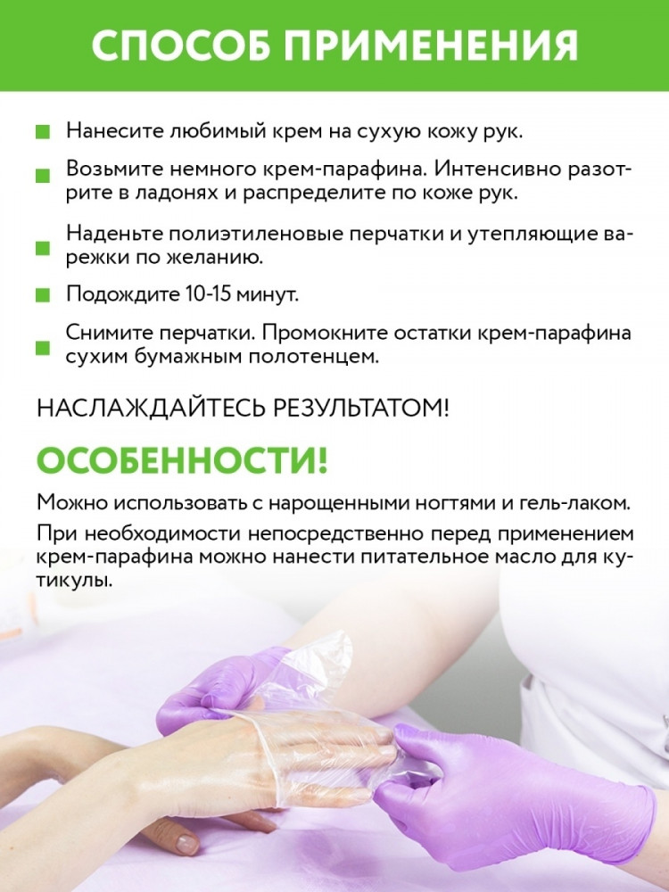 прекрасный крем парафин, увлажняет кожу рук, образует защитную плёнку. очень довольна покупкой. рекомендую.