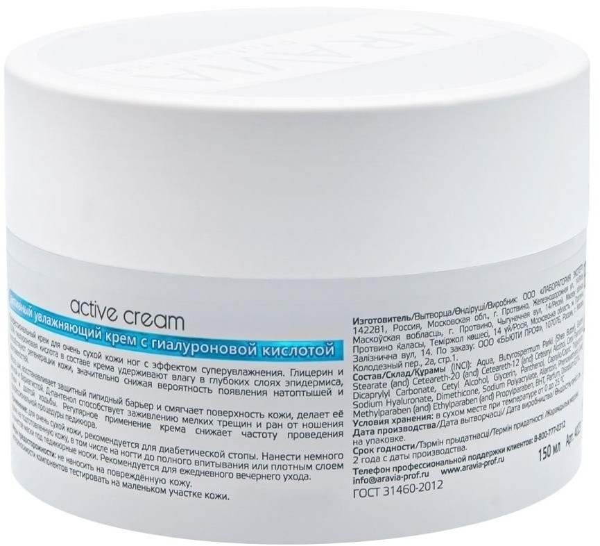 Aravia Крем для ног увлажняющий с гиалуроновой кислотой «Active Cream»-20% +43