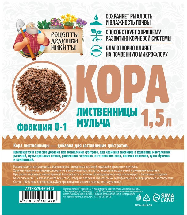 По цене нормально. Полезна для мульчирования гортензии, хвойных, голубики. Я буду смешивать с торфом. Заметила, что мульчирование сокращает поливы!