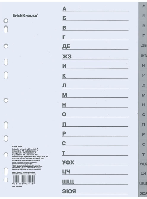 Erich Krause Разделитель листов алфавитныйВ данный момент этот товар отсутствует в продаже. Возможно, у нас найдется аналогичный или похожий товар здесь. Разделители листов из высококачественного пластика с текстурой поверхности «песок», на которой не видно отпечатков пальцев и мелких царапин. Предназначены для сортировки документов по разделам. Универсальная перфорация совместима с различными типами папок. Размер — 223×297×2,5 мм, толщина — 0,12 мм. |
