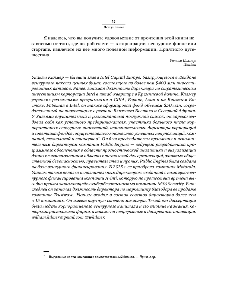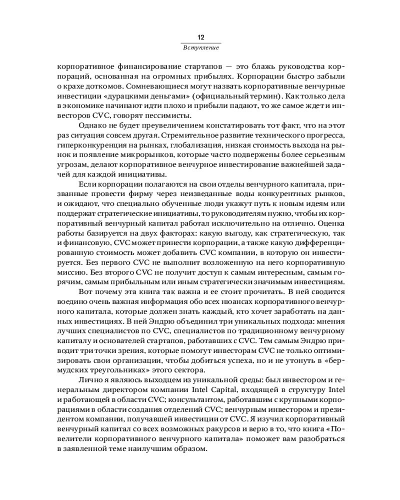 💳 Оплатить за товар можно при получении 🇰🇿 Есть бесплатная доставка по Казахстану от 1 дня 🎁 Копите бонусы с каждой покупки Эндрю Романс, соучредитель и генеральный партнер 7BC Venture Capital, собрал самую важную информацию обо всех нюансах корпоративного венчурного капитала и провел более 50 интервью с лучшими специалистами по CVC, экспертами по традиционному венчурному инвестированию и стартаперами, работавшими с CVC. Они рассказывают, как извлекать прибыль из быстрорастущих бизнесов и не потеряться в «бермудских треугольниках» инноваций. Вы поймете, для чего корпорации создают CVC и как структурируют работу со стартапами, как управляют капиталом и как используют инновации в конкурентной борьбе. |