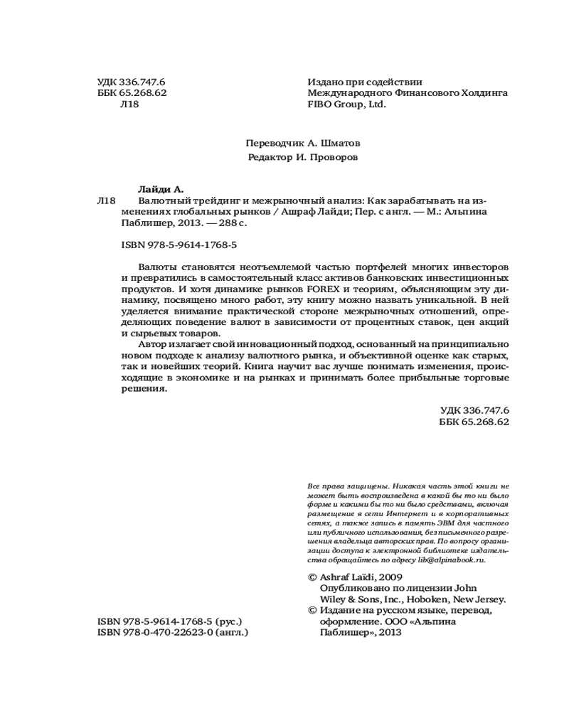 Валютный трейдинг и межрыночный анализ. Как зарабатывать на изменениях глобальных рынковВ данный момент этот товар отсутствует в продаже. Возможно, у нас найдется аналогичный или похожий товар здесь. О валютном трейдинге. Валюты становятся неотъемлемой частью портфелей многих инвесторов и превратились в самостоятельный класс активов банковских инвестиционных продуктов. И хотя динамике рынков FOREX и теориям, объясняющим эту динамику, посвящено много работ, эту книгу можно назвать уникальной. В ней уделяется внимание практической стороне межрыночных отношений, определяющих поведение валют в зависимости от процентных ставок, цен акций и сырьевых товаров. |