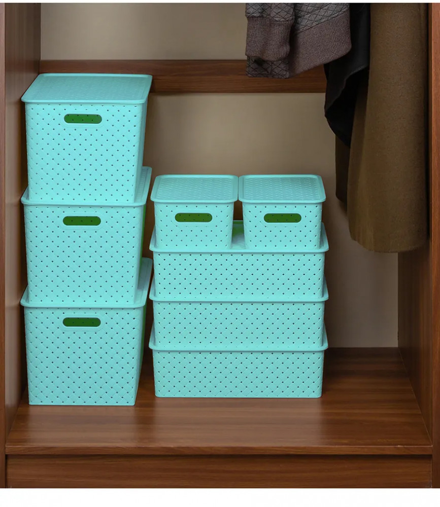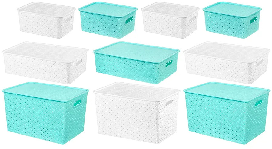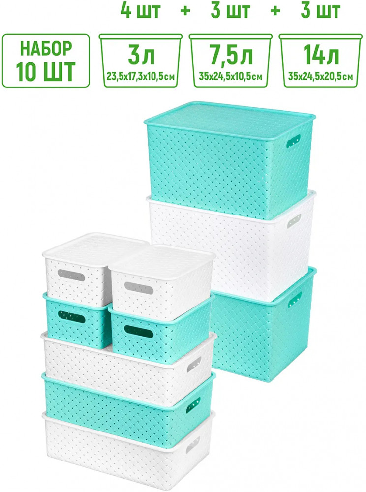 Набор из 10-ти корзин с ручками и крышками можно разместить на кухне, в ванной, прихожей, офисе, гараже или в шкафу. Большие коробки подойдут для бытовой химии, игрушек, одежды (для шапок, перчаток, белья, носков), а маленькие корзинки — для канцелярии, косметики, украшений, рукоделия (для пряжи, вязания) и других мелочей.
