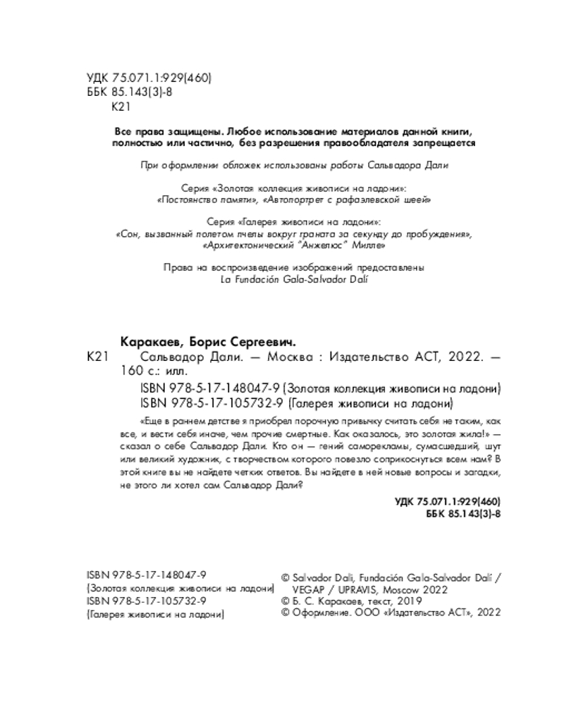 💳 Оплатить за товар можно при получении 🇰🇿 Есть бесплатная доставка по Казахстану от 1 дня 🎁 Копите бонусы с каждой покупки Серия: Галерея живописи на ладони Компактный иллюстрированный гид по творчеству Сальвадора Дали размером с ладонь, напечатанный на матовой мелованной бумаге. «Еще в раннем детстве я приобрел порочную привычку считать себя не таким, как все, и вести себя иначе, чем прочие смертные. Как оказалось, это золотая жила!» — Сальвадор Дали. |