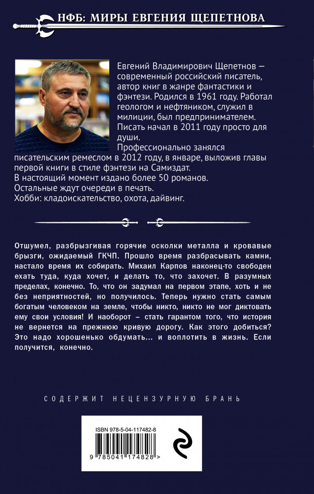 1972. ОлигархВ данный момент этот товар отсутствует в продаже. Возможно, у нас найдется аналогичный или похожий товар здесь. Серия: Новый фантастический боевик. Миры Евгения Щепетнова Евгений Щепетнов — бывший офицер милиции, инженер-геолог, путешественник и искатель приключений. Обладает уникальным житейским опытом, который помогает писать романы в популярных жанрах: фэнтези и попаданцев в другие миры. |