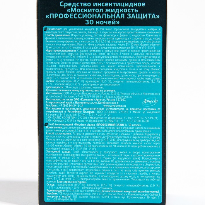 💳 Оплатить за товар можно при получении 🇰🇿 Есть бесплатная доставка по Казахстану от 1 дня 🎁 Копите бонусы с каждой покупки Уникальная двухкомпонентная жидкость начинает активно воздействовать на комаров внутри помещения сразу после включения прибора в сеть. Основой новой жидкости является рецептура, в состав которой входят 2 действующих вещества. Первое вещество обладает способностью быстро испаряться, не дожидаясь нагрева плато прибора до максимальной температуры, что обеспечивает быстрый эффект. Второе действующее вещество, испаряясь постепенно и усиливая эффект от первого действующего вещества, обеспечивает эффективное уничтожение комаров на всю ночь. Время защитного действия — до 30 ночей. |