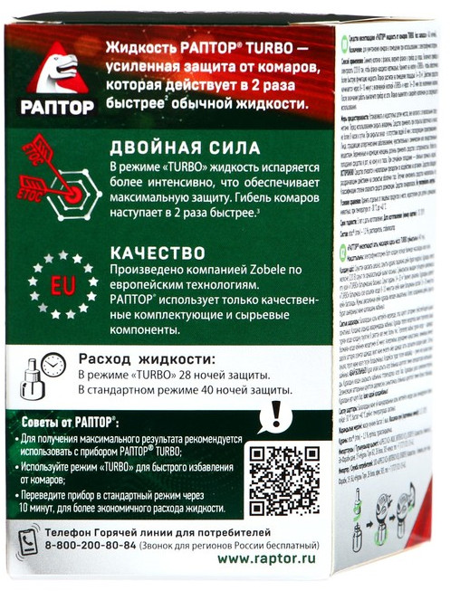 💳 Оплатить за товар можно при получении 🇰🇿 Есть бесплатная доставка по Казахстану от 1 дня 🎁 Копите бонусы с каждой покупки Принцип действия жидкости Раптор Turbo очень прост: при нагревании стержня флакончика от керамического нагревательного элемента прибора начинается медленное испарение действующего вещества. Испаряясь, оно постепенно заполняет пространство, оказывая свое воздействие на насекомых. При включении кнопки Turbo температура на керамическом элементе становится выше, что приводит к более интенсивному испарению жидкости из флакончика. Таким образом, требуемая концентрация действующего вещества в комнате достигается в 2 раза быстрее, чем при использовании обычного режима. |
