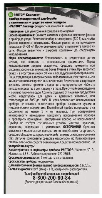 Раптор Комплект для защиты от комаров-25% +112 эффективность высокая концентрация простота использования неприятный запах