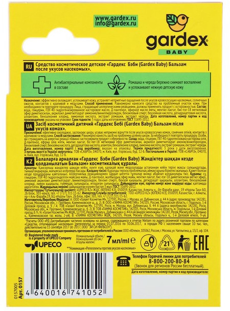 💳 Оплатить за товар можно при получении 🇰🇿 Есть бесплатная доставка по Казахстану от 1 дня 🎁 Копите бонусы с каждой покупки Серия: Baby Бальзам от торговой марки «Gardex» облегчит зуд на коже вашего ребёнка после укусов комаров, солнечных ожогов, контакта с крапивой или медузами. |