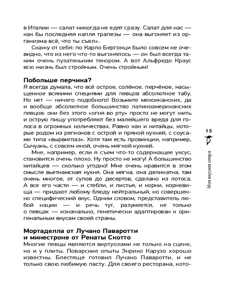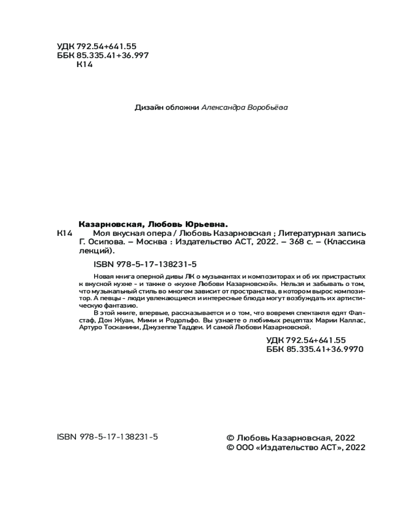 💳 Оплатить за товар можно при получении 🇰🇿 Есть бесплатная доставка по Казахстану 🎁 Копите бонусы с каждой покупки Серия: Классика лекций Две предыдущие книги оперной певицы Любови Казарновской — «Оперные тайны» и «Страсти по опере» — были посвящены главным образом тем чертам в жизни певцов, композиторов, либреттистов, которые непосредственно связаны с их профессиональной деятельностью. Но для того чтобы в полном объёме постичь, как и чем они жили, каковы были их характеры, стоит приглядеться и к их рациону. |