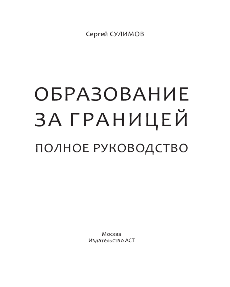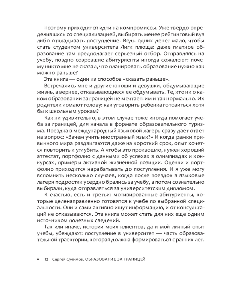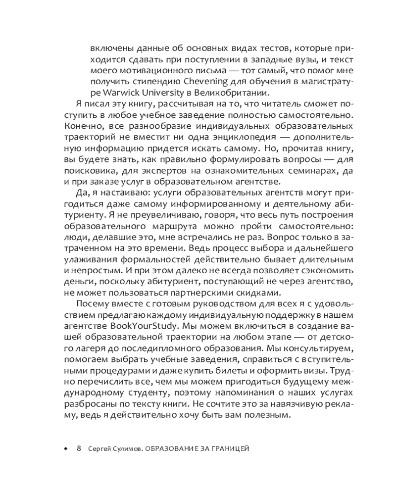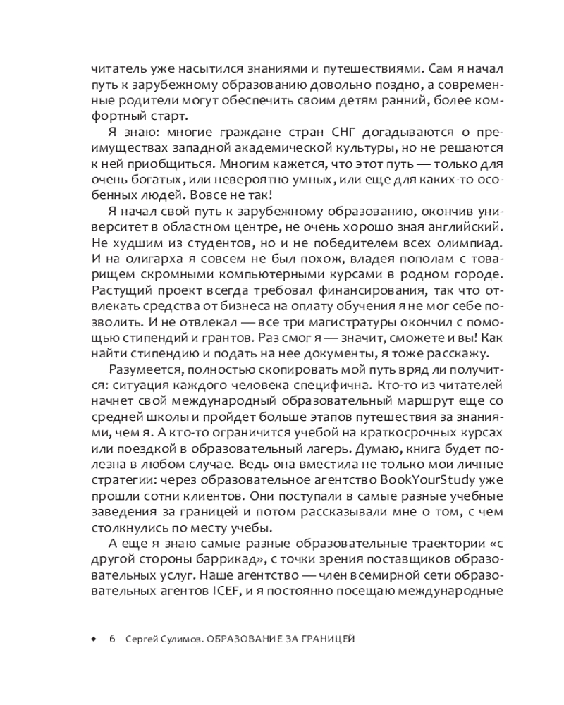 Образование за границей. Полное руководствоВ данный момент этот товар отсутствует в продаже. Возможно, у нас найдется аналогичный или похожий товар здесь. Серия: БизнесНаставник Автор этой книги, создатель и руководитель образовательного агентства BookYourStudy Сергей Сулимов, успешно с полным финансированием окончил магистратуру в США, Великобритании и России. Получал правительственные стипендии США (Muskie), Великобритании (Chevening), Германии, стипендии университетов. Сергей Сулимов уверен, что международное образование полезно, так как обеспечивает широкий кругозор и доступ к интеллектуальным богатствам всего человечества. Автор убежден, что получить международное образование может не только супербогатый или супергениальный человек, но и каждый, кто заранее соберет всю нужную информацию и построит правильный образовательный маршрут. Однако самостоятельно собирать сведения о школах, вузах и образовательных лагерях разных стран не так-то просто — лучше обратиться к профессионалу. Личный опыт автора, истории его клиентов, экспертные знания агента по международному образованию легли в основу этой книги. Прочитав ее, вы сможете выбрать лучший из доступных вам образовательных маршрутов и найти для него источники финансирования. |