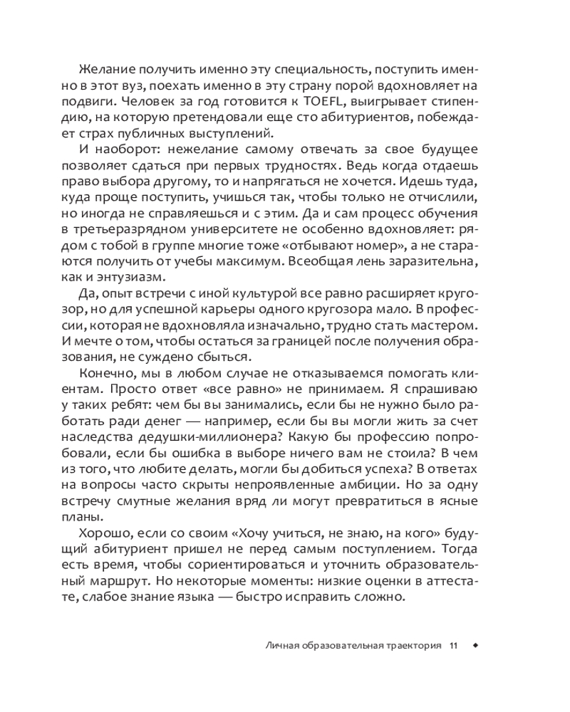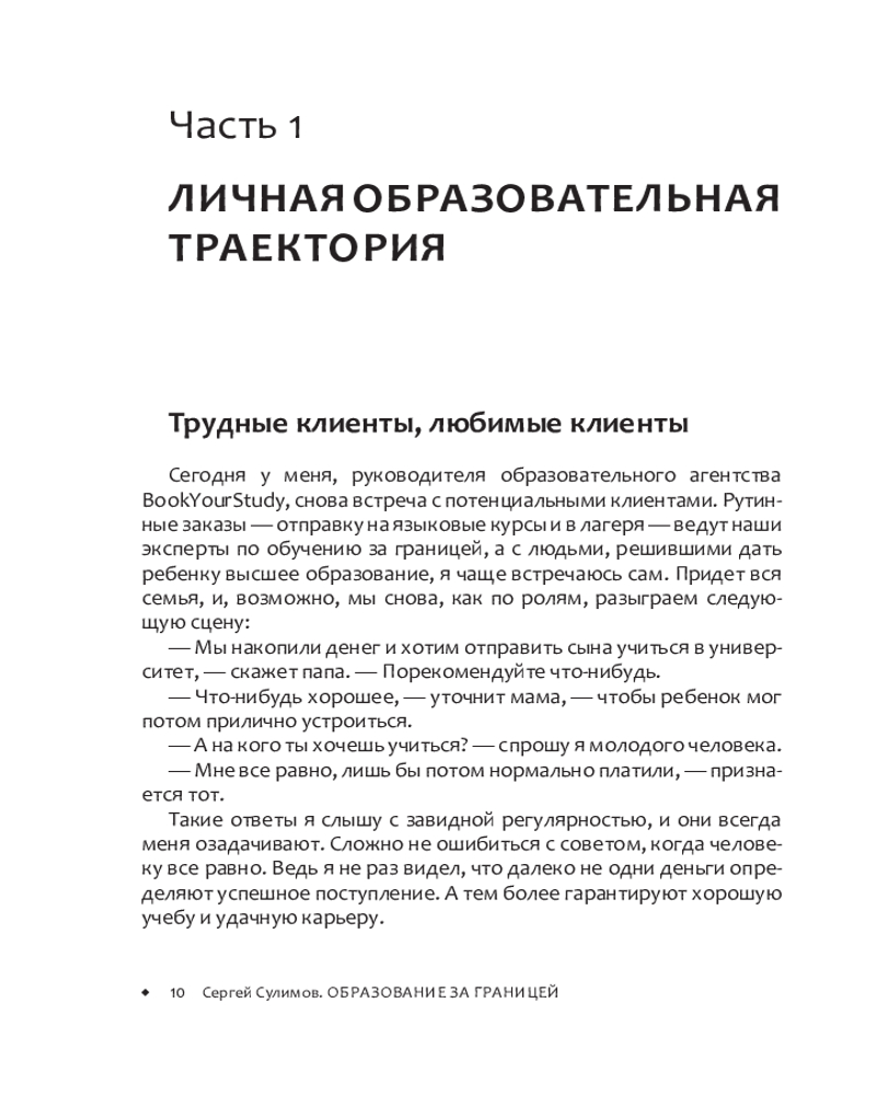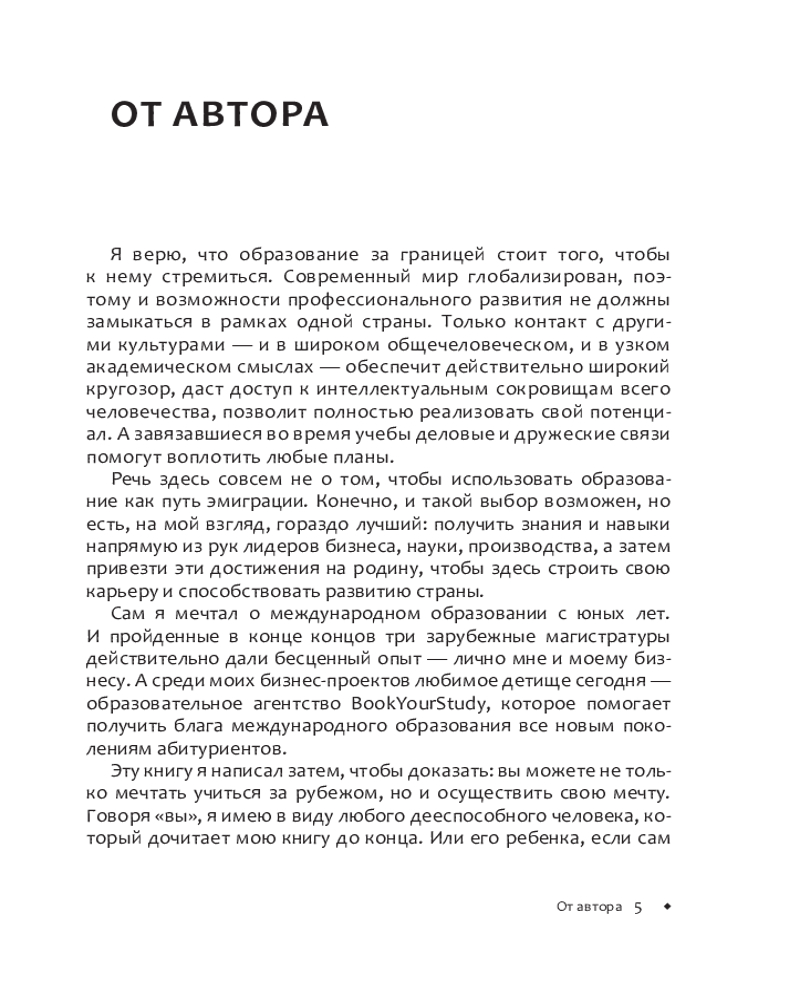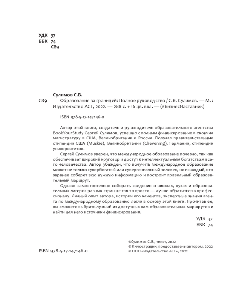 Образование за границей. Полное руководствоВ данный момент этот товар отсутствует в продаже. Возможно, у нас найдется аналогичный или похожий товар здесь. Серия: БизнесНаставник Автор этой книги, создатель и руководитель образовательного агентства BookYourStudy Сергей Сулимов, успешно с полным финансированием окончил магистратуру в США, Великобритании и России. Получал правительственные стипендии США (Muskie), Великобритании (Chevening), Германии, стипендии университетов. Сергей Сулимов уверен, что международное образование полезно, так как обеспечивает широкий кругозор и доступ к интеллектуальным богатствам всего человечества. Автор убежден, что получить международное образование может не только супербогатый или супергениальный человек, но и каждый, кто заранее соберет всю нужную информацию и построит правильный образовательный маршрут. Однако самостоятельно собирать сведения о школах, вузах и образовательных лагерях разных стран не так-то просто — лучше обратиться к профессионалу. Личный опыт автора, истории его клиентов, экспертные знания агента по международному образованию легли в основу этой книги. Прочитав ее, вы сможете выбрать лучший из доступных вам образовательных маршрутов и найти для него источники финансирования. |