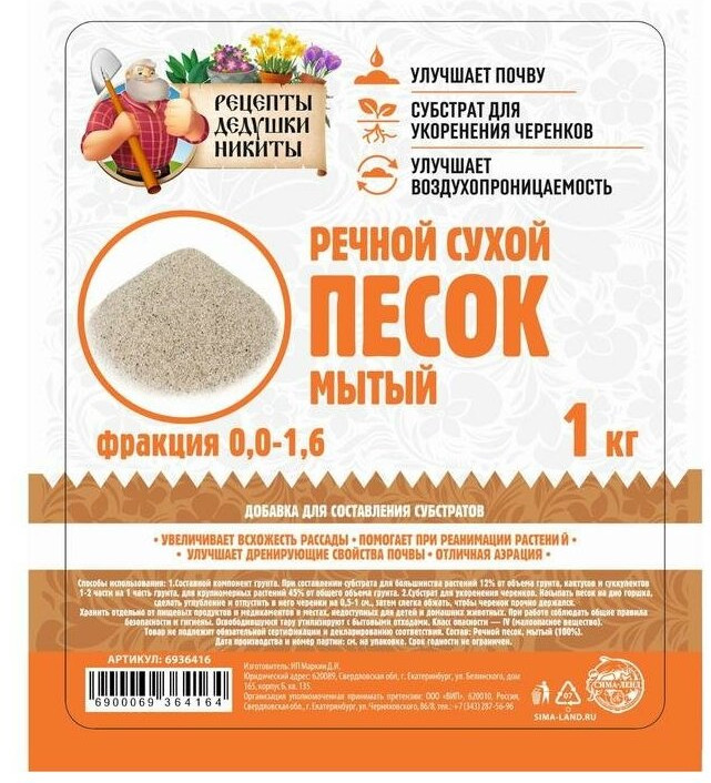 Рецепты дедушки Никиты Песок речной сухойчистый мелкая фракция подходит для грунта В данный момент этот товар отсутствует в продаже. Возможно, у нас найдется аналогичный или похожий товар здесь. Речной песок используется как добавка для составления субстратов: |