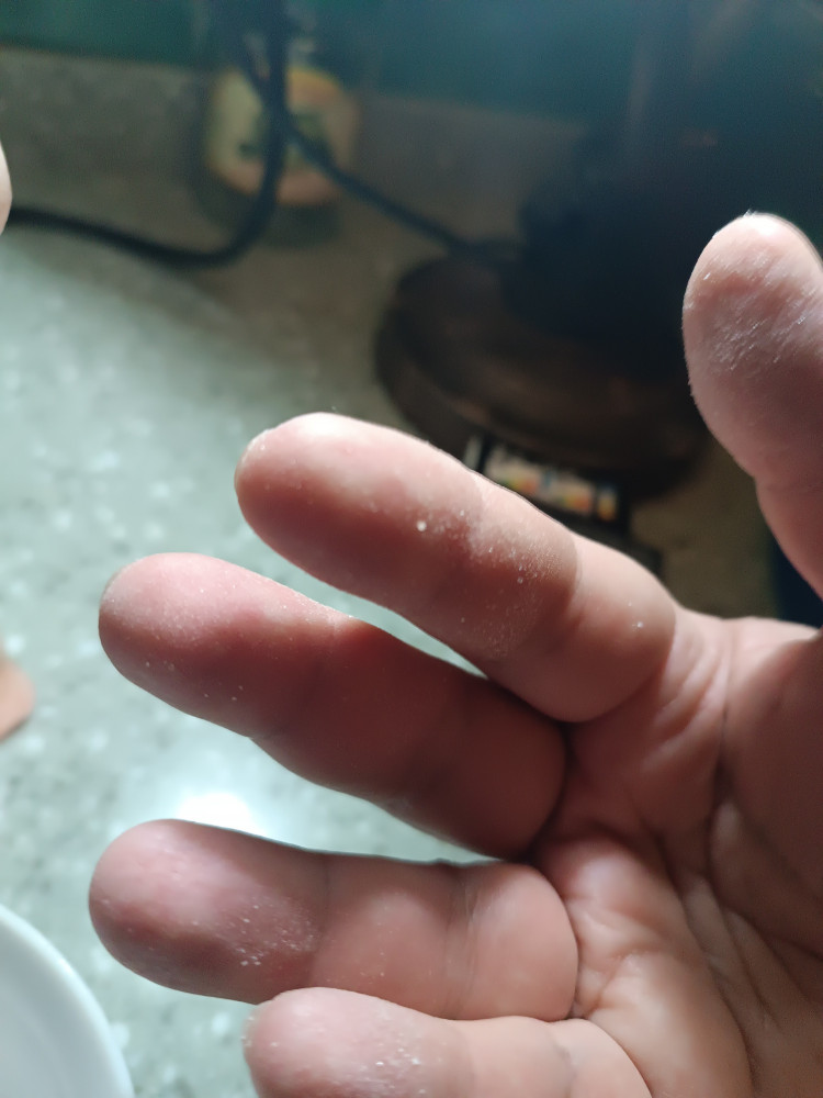 до этого брала в коробке -она была вся крупинка к крупинке без пыли, а эту лучше пальцами не брать остаётся пыль солёная белая (соль смолотая до пыли) т.е. конечно написано "мелкая" но должна быть равномерная
