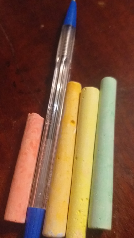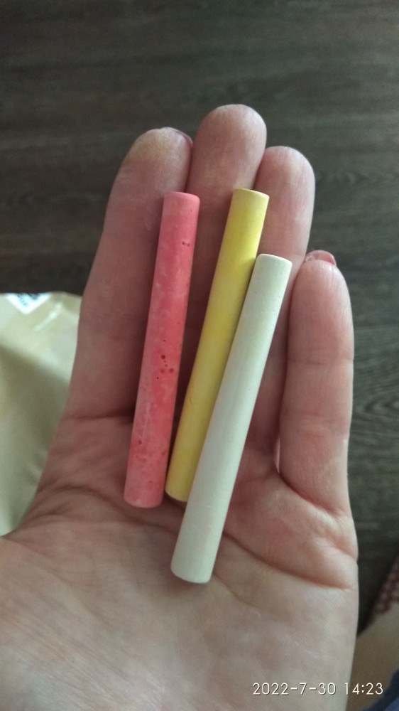 Мелки очень тонкие, выполнены в виде конуса, одна часть примерно сантиметр, а другая 7-8 мм. При рисовании ломаются пополам. Использовали для доски.