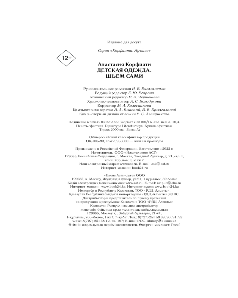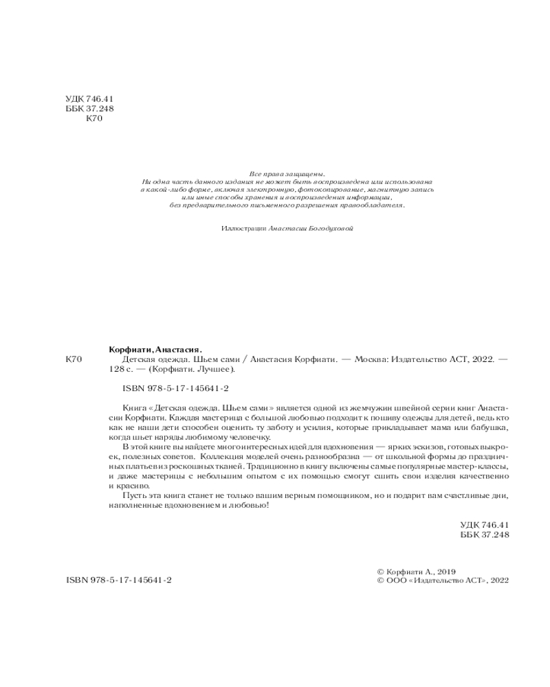Детская одежда. Шьем самиВ данный момент этот товар отсутствует в продаже. Возможно, у нас найдется аналогичный или похожий товар здесь. Серия: Корфиати. Лучшее Чтобы создать чудо своими руками, вам не нужна волшебная палочка. Нужны иголка и книга Анастасии Корфиати «Детская одежда. Шьём сами». Автор посвятила моде больше четверти века и умеет рассказывать о создании одежды легко, ее мастер-классы помогут даже тем, кто никогда не брался за выкройку. Шить — это весело и интересно, и к тому же, это отличный способ провести время с ребенком. Сшейте что-нибудь вместе, и вы будете особенно любить эту вещь! |