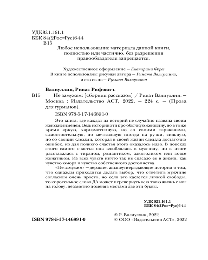 💳 Оплатить за товар можно при получении 🇰🇿 Есть бесплатная доставка по Казахстану от 1 дня 🎁 Копите бонусы с каждой покупки Серия: Проза для гурманов Ринат Валиуллин — писатель, поэт, автор бестселлеров «Состояние — Питер», «Где валяются поцелуи», «Легкомыслие» и многих других. Писатель завоевал сердца читателей благодаря тонкому психологическому чутью, фирменному литературному стилю, емким жизненным цитатам, которые применяют в своей практике даже психологи и коучи. Его новая книга «Не замужем» — продолжение популярной трилогии «НЕ», в которую вошли полюбившиеся десяткам тысяч читателей «Не складывается — вычитай», «Не дура» и «Не хочу». |