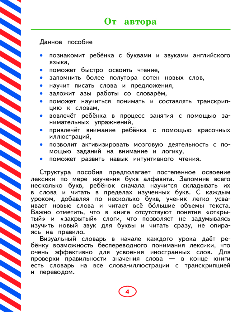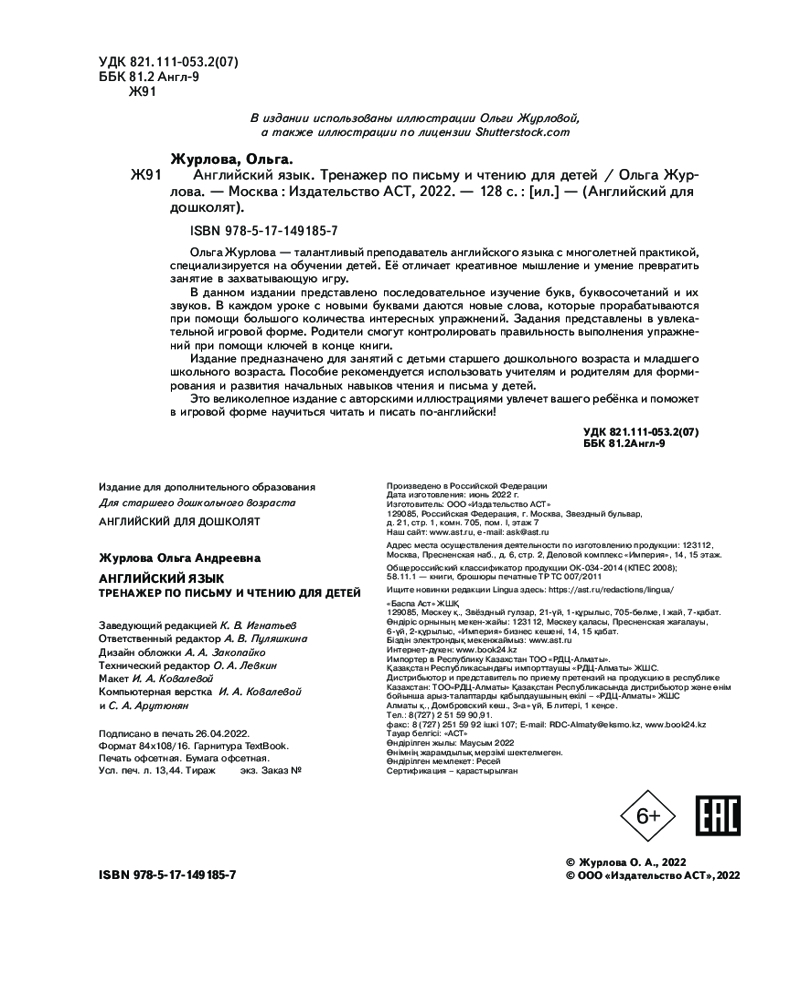💳 Оплатить за товар можно при получении 🇰🇿 Есть бесплатная доставка по Казахстану от 1 дня 🎁 Копите бонусы с каждой покупки Серия: Английский для дошколят Ольга Журлова — талантливый преподаватель английского языка с многолетней практикой, специализируется на обучении детей. Её отличает креативное мышление и умение превратить занятие в захватывающую игру. В данном издании представлено последовательное изучение букв, буквосочетаний и их звуков. В каждом уроке с новыми буквами даются новые слова, которые прорабатываются при помощи большого количества интересных упражнений. Задания представлены в увлекательной игровой форме. Родители смогут контролировать правильность выполнения упражнений при помощи ключей в конце книги. Издание предназначено для занятий с детьми старшего дошкольного возраста и младшего школьного возраста. Пособие рекомендуется использовать учителям и родителям для формирования и развития начальных навыков чтения и письма у детей. Это великолепное издание с авторскими иллюстрациями увлечет вашего ребёнка и поможет в игровой форме научиться читать и писать по-английски! |
