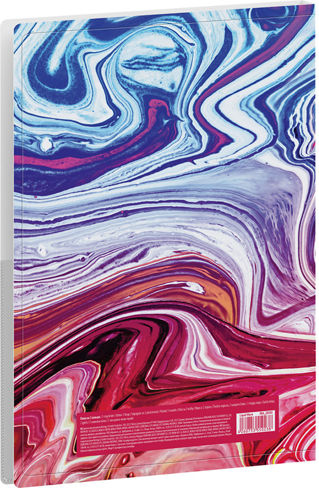 Папка пластиковая на 2 D-кольцах Berlingo «Liquid Wave» формата А4 с рисунком. Яркий дизайн коллекционной серии Berlingo «Liquid Wave». Белый цвет внутренней поверхности. Специальная D-форма колец помогает удобно и ровно хранить документы, которые могут быть выровнены по левому краю, благодаря боковой вертикальной стенке кольца. Диаметр колец 20 мм.