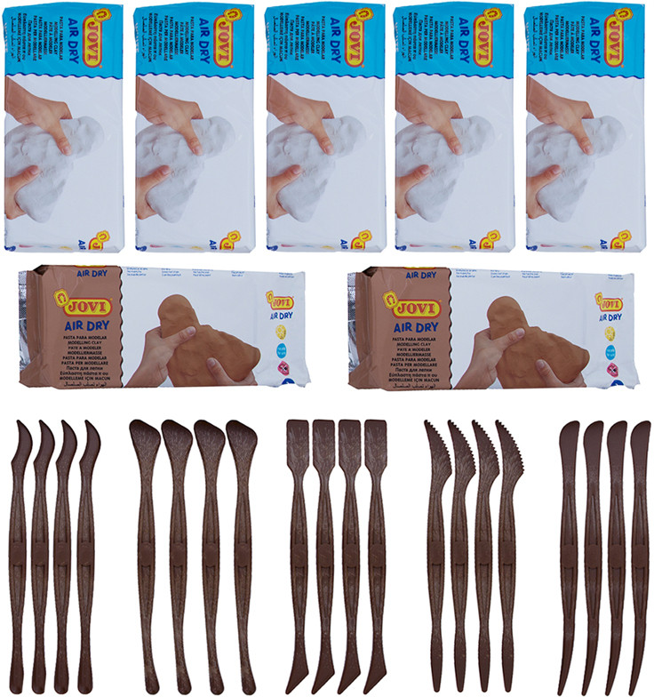 В наборе: паста — белый цвет (5 шт. по 500 г), терракотовый цвет (2 шт. по 500 г), 20 двусторонних стеков для лепки. |